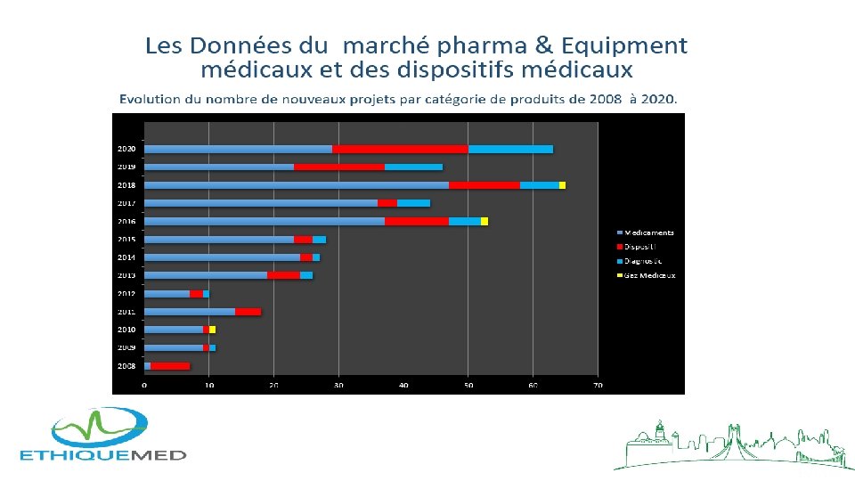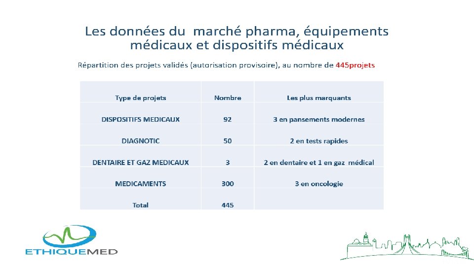 Données sur le marché du dispositif médical en Algérie • La facture d’importation des équipements médicaux par le secteur privé a été évaluée à • 286 millions € en 2019 et presque a 500 millions € par le secteur public. • Sur les 1 022 opérateurs agrées , le marché est conduit par les 40 opérateurs relatifs aux différentes spécialités ayant effectué un nombre important d’opérations d’importation, parmi ces opérateurs les 16 premiers représentent 80% de montant total des importations, ils se spécialisent dans • l’imagerie médicale • Le dispositif médical • La désinfection • Le dentaire • Les réactifs • l’hémodialyse • Les prothèses orthopédiques • Les implants • Afin d’encourager la production nationale et la commercialisation des produits locaux au détriment des importations , certains opérateurs souhaiteraient la genèse d’une assise juridique prévoyant le montage ou la fabrication de matériel et équipements médicaux conformément aux normes internationales.