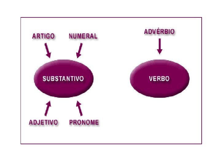Essas dez classes de palavras se dividem em dois grandes grupos: substantivo Variáveis adjetivo artigo pronome numeral verbo preposição Invariáveis advérbio conjunção interjeição