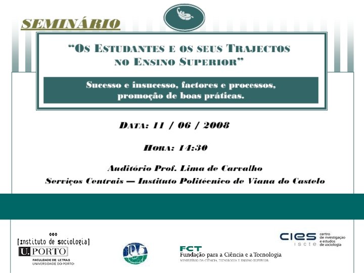 Considerações metodológicas [3] (iii) Amostra populacional: Ø Entre 150 a 200 estudantes ou ex-estudantes do ensino superior português; Ø Recolha de contactos em “bola de neve”, sem pretensões de representatividade, mas abrangente e estratificada. Ø Estratificação baseada em: variáveis clássicas: sexo idade zona geográfica de residência classe social de origem escolaridade da família de origem variáveis que remetem para as trajectórias escolares: instituições frequentadas (tipo de tutela) área de estudos incidência de sucesso / insucesso no percurso académico inserção laboral concomitante com estudos (trabalhadores-estudantes)