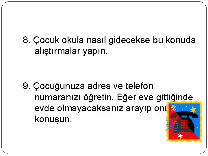 8. Çocuk okula nasıl gidecekse bu konuda alıştırmalar yapın. 9. Çocuğunuza adres ve telefon numaranızı öğretin. Eğer eve gittiğinde evde olmayacaksanız arayıp onunla konuşun.