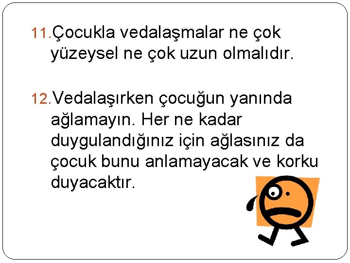11. Çocukla vedalaşmalar ne çok yüzeysel ne çok uzun olmalıdır. 12. Vedalaşırken çocuğun yanında ağlamayın. Her ne kadar duygulandığınız için ağlasınız da çocuk bunu anlamayacak ve korku duyacaktır.