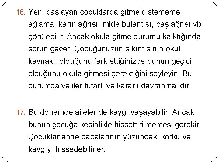 16. Yeni başlayan çocuklarda gitmek istememe, ağlama, karın ağrısı, mide bulantısı, baş ağrısı vb. görülebilir. Ancak okula gitme durumu kalktığında sorun geçer. Çocuğunuzun sıkıntısının okul kaynaklı olduğunu fark ettiğinizde bunun geçici olduğunu okula gitmesi gerektiğini söyleyin. Bu durumda veliler tutarlı ve kararlı davranmalıdır. 17. Bu dönemde aileler de kaygı yaşayabilir. Ancak bunun çocuğa kesinlikle hissettirilmemesi gerekir. Çocuklar anne babalarının yüzündeki korku ve kaygıyı hissedebilirler.