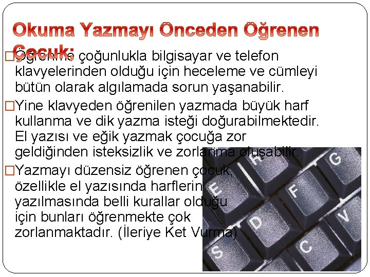 �Öğrenme çoğunlukla bilgisayar ve telefon klavyelerinden olduğu için heceleme ve cümleyi bütün olarak algılamada sorun yaşanabilir. �Yine klavyeden öğrenilen yazmada büyük harf kullanma ve dik yazma isteği doğurabilmektedir. El yazısı ve eğik yazmak çocuğa zor geldiğinden isteksizlik ve zorlanma oluşabilir. �Yazmayı düzensiz öğrenen çocuk, özellikle el yazısında harflerin yazılmasında belli kurallar olduğu için bunları öğrenmekte çok zorlanmaktadır. (İleriye Ket Vurma)