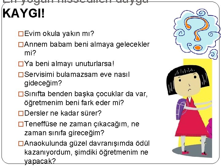 En yoğun hissedilen duygu KAYGI! � Evim okula yakın mı? � Annem babam beni almaya gelecekler mi? � Ya beni almayı unuturlarsa! � Servisimi bulamazsam eve nasıl gideceğim? � Sınıfta benden başka çocuklar da var, öğretmenim beni fark eder mi? � Dersler ne kadar sürer? � Teneffüse ne zaman çıkacağım, ne zaman sınıfa gireceğim? � Anaokulunda güzel davranışımda ödül kazanıyordum, şimdiki öğretmenim ne yapacak?
