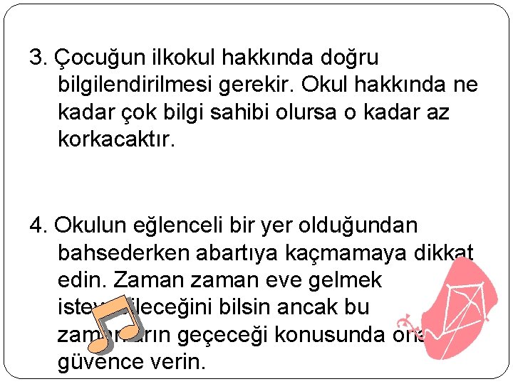 3. Çocuğun ilkokul hakkında doğru bilgilendirilmesi gerekir. Okul hakkında ne kadar çok bilgi sahibi olursa o kadar az korkacaktır. 4. Okulun eğlenceli bir yer olduğundan bahsederken abartıya kaçmamaya dikkat edin. Zaman zaman eve gelmek isteyebileceğini bilsin ancak bu zamanların geçeceği konusunda ona güvence verin.