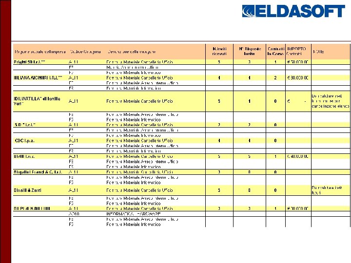ALICE Elenchi Operatori Economici Riduzione/Semplificazione iscrizione fornitori; Ricerca rapida dei fornitori abilitati per categorie merceologica e utilizzo dei criteri rotazione; Semplificazione della comunicazione con i fornitori (email, sito internet); Monitoraggio comportamenti dei fornitori nelle gare espletate per analizzare il loro comportamento;