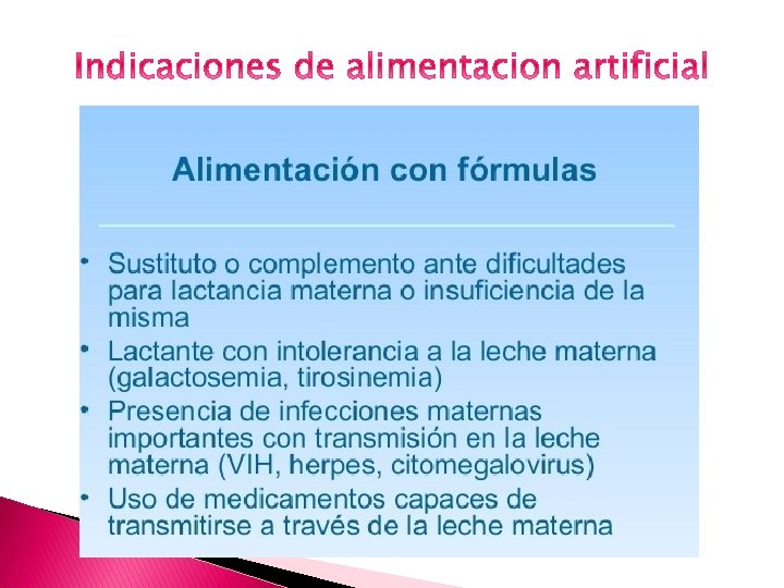 Lactancia artificial � La alimentación artificial supone la administración de fórmulas o preparados lácteos diversos para la sustitución, total o parcial de la leche materna.