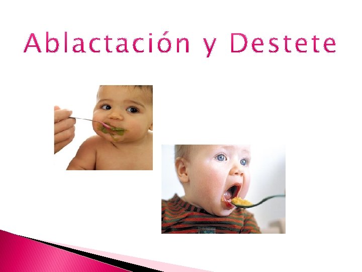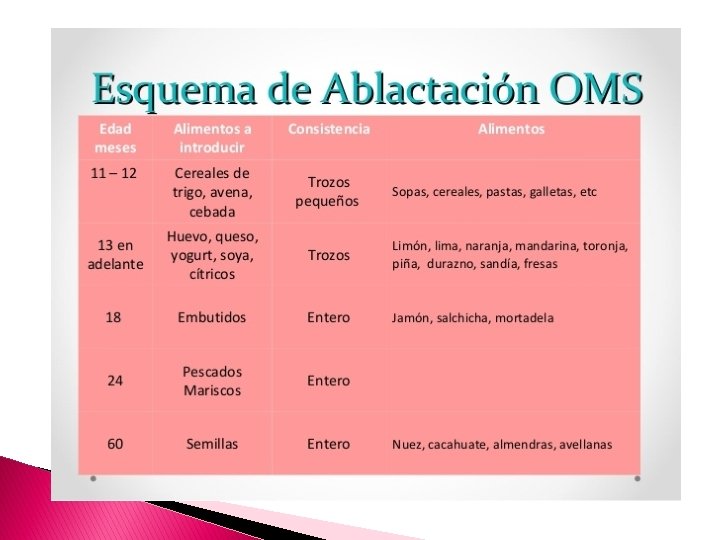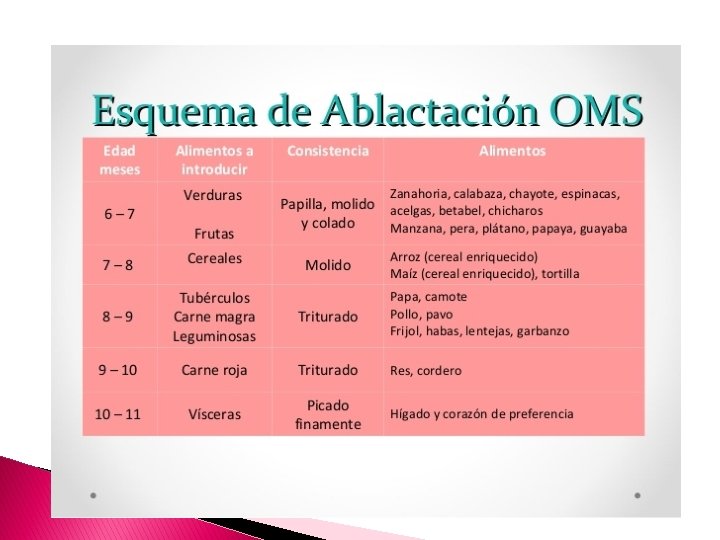 Ablactación � Es el periodo durante el cual otros alimentos o líquidos son provistos al niño junto con la lactancia materna sin desplazarla. � Ocurre a partir de los 6 meses de edad. (después trastornos del crecimiento por aporte nutrimental).