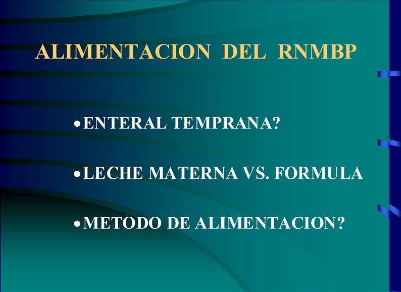 ALIMENTACION ENTERAL MINIMA · INICIAR EN EL RNMBP ESTABLE EN PRIMERA SEMANA DE VIDA · 2. 5 - 20 ML/KG/DIA · INCREMENTO DE ACUERDO A ESTABILIDAD 5 - 10 ML/KG/DIA Y LUEGO 10 - 20 ML/KG/DIA · INTERMITENTE CADA TRES HORAS; GASTROCLISIS EN CASO NECESARIO
