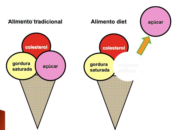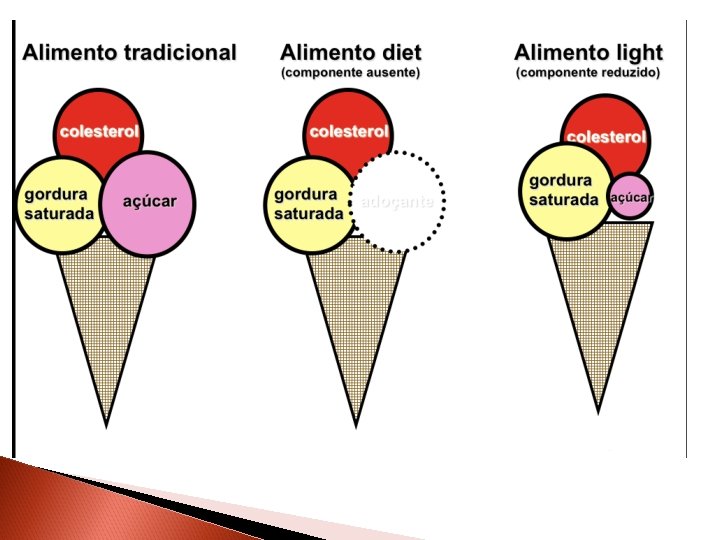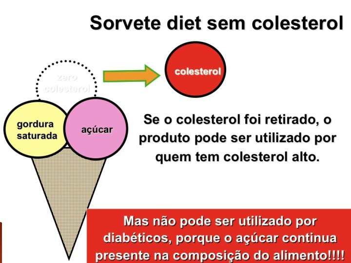 colesterol gordura saturada açúcar Produtos diet têm que garantir ao consumidor que aquela substância foi totalmente retirada do alimento, podendo ser utilizado por diabéticos (não tem açúcar), por pessoas com colesterol elevado (colesterol zero), ou com hipertensão (sem sal), etc. 12