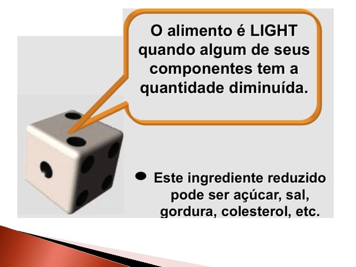 Light ou baixo Portaria nº 27, de 13 de janeiro de 1998 (ANVISA): Para que um alimento seja considerado “baixo” ou “light”, quanto ao atributo valor energético, o mesmo deve fornecer no máximo 40 kcal/100 g ou 20 kcal/100 ml. SACAROSE: a alegação de light é aceita apenas para alimentos com no máximo 5 g de sacarose em 100 g ou 100 ml do produto. GORDURAS TOTAIS: a alegação “baixo” ou “light” pode ser utilizada quando o teor de gorduras for no máximo 3 g/100 g ou 1, 5 g/100 m. L. O atributo “reduzido” é admitido quando houver uma redução de no mínimo 25% do produto convencional.