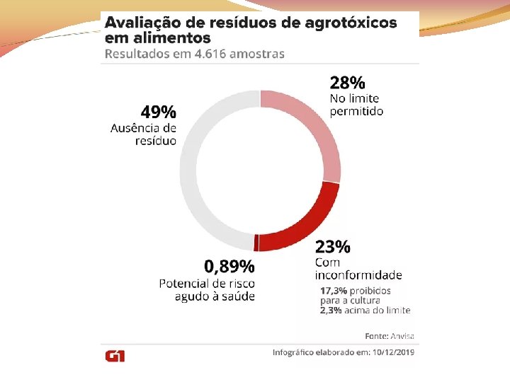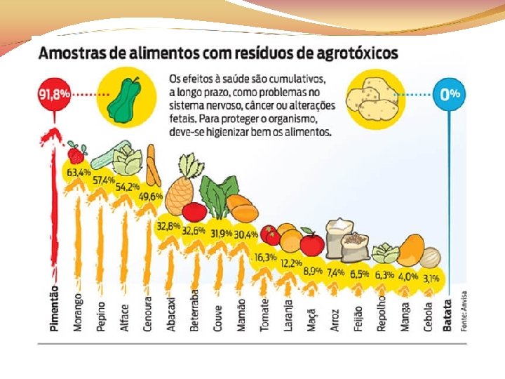 A produção de alimentos por sistema convencional pode acarretar resíduos de agrotóxicos em níveis preocupantes para a saúde pública Pesquisa realizada pela ANVISA e FIOCRUZ analisou 1. 278 amostras de alface, banana, batata, cenoura, laranja, maçã, mamão, morango e tomate e cerca de 81% continham algum resíduo de agrotóxico (Teophilo et al. , 2013)