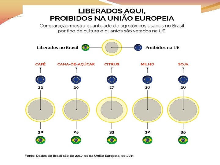 Fabricado na Alemanha O Brasil é o maior consumidor de agrotóxicos do mundo em números absolutos, segundo a Organização das Nações Unidas para Alimentação e Agricultura (FAO), e tem uma lista de 2. 306 produtos formulados de agrotóxicos registrados para venda, de acordo com dados do sistema Agrofit, do Ministério da Agricultura. Dos 353 princípios ativos liberados no Brasil, quase metade são proibidos na União Europeia (UE).