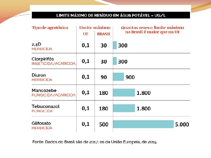 Bayer e Basf entre outras. . . Entre eles, sete substâncias (cinco da Bayer e duas da Basf) tiveram a permissão de uso negada depois do processo de registro ou tiveram o registro explicitamente revogado pela UE por serem nocivas se ingeridas ou inaladas, por serem muito tóxicas para corpos d'água, gerarem reações alérgicas na pele, prejudicarem órgãos internos, provocarem graves queimadoras na pele e feridas nos olhos, por suspeita de causar câncer e distúrbios na fertilidade e por serem prejudiciais a fetos e a bebês em amamentação.