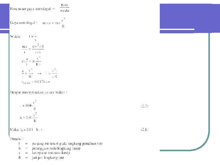 Lengkung Peralihan Lengkung peralihan dibuat untuk mengeliminasi perubahan gaya sentrifugal sedemikian rupa sehinggga penumpang di dalam kereta api tetap terjamin kenyamanannya l Panjang lengkung peralihan merupakan fungsi dari perbahan gaya sentrifugal per satuan waktu, kecepatan dan jari lengkung l