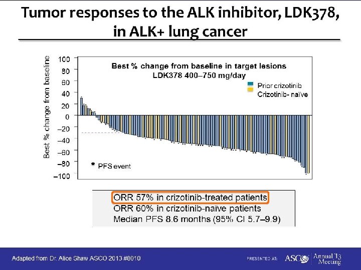 Crizotinib for ALK+ advanced NSCLC: RR appr. 60%, PFS 7. 7 -9. 7 mos Study No. of patients RR (%) PFS (mos. ) A 8081001 143 60. 8 9. 7 A 8081005 261 59. 8∞ 8. 1 A 8081007 173 65* 7. 7 French Temporary Authorization for use of Crizotinib 230 56. 5 Not reported ∞ 259 pts evaluable for response *Independent radiologic review Camidge, et al. Lancet Oncol 2012 Kim, et al. ASCO 2012 Shaw, et al. NEJM 2013 Perol, et al. ECCO 2013