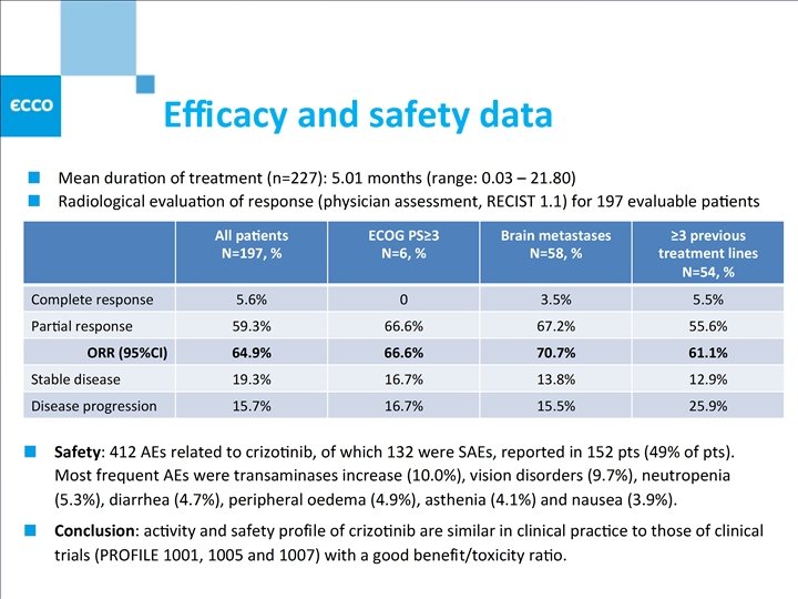 Hsp 90 inhibitor AUY 922: activity in ALK+ patients (n=19/22) Felip, et al. ESMO 2012