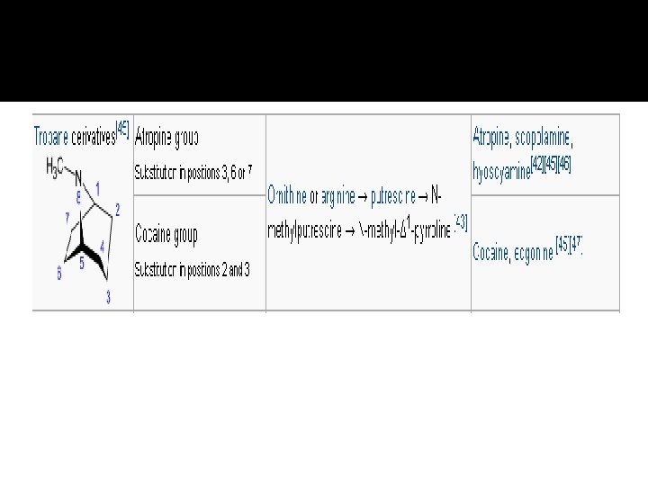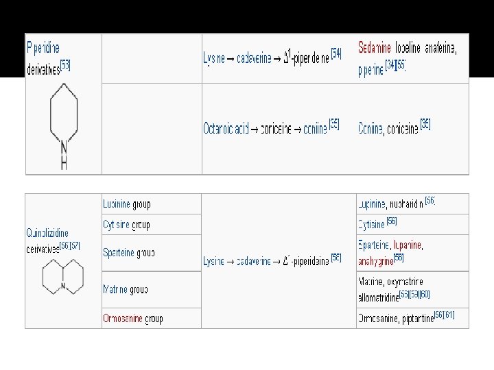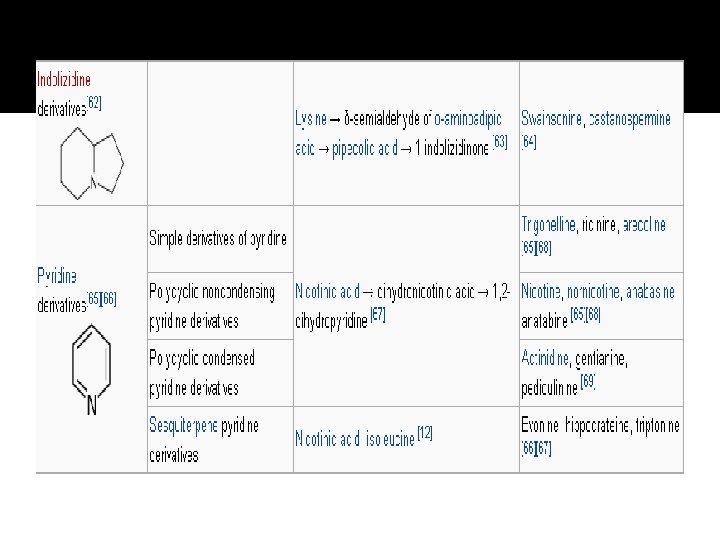 Classification �More recent classifications are based on similarity of the carbon skeleton (e. g. , indole, isoquinoline-, and pyridine-like) or biogenetic precursor (ornithine, lysine, tyrosine tryptophan, etc. ). However, they require compromises in borderline cases; for example, nicotine contains a pyridine fragment from nicotinamide and pyrrolidine part from ornithine and therefore can be assigned to both classes.