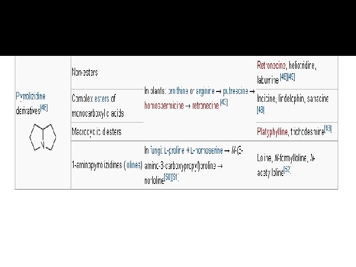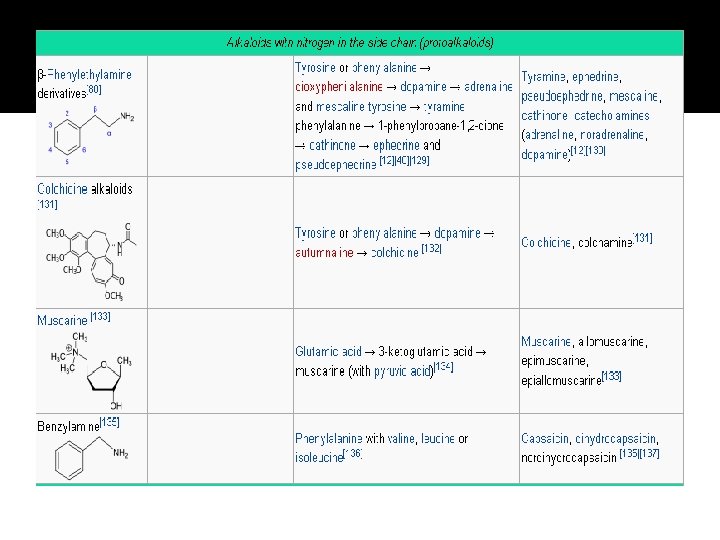 �"Protoalkaloids“ - it contains nitrogen and also originate from amino acids. Examples include mescaline, adrenaline and ephedrine. �Polyamine alkaloids – derivatives of putrescine, spermidine, and spermine. �Peptide and cyclopeptide alkaloids.