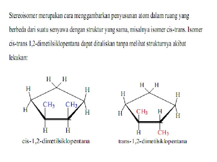 Cl Cl H H C Cl Cis-1, 2 -dikloroetena Trans-1, 2 -dikloroetena t. d. 60 o. C t. d. 48 o. C Cis jika atom yang sama terletak sejajar Trans jika atom yag sama terletak berseberangan
