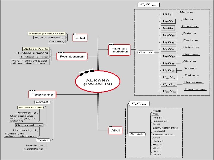 ALKANA Cn. H 2 n+2 IKATAN TUNGGAL ALKENA Cn. H 2 n IKATAN RANGKAP CH 4 metana - ALKUNA Cn. H 2 n-2 IKATAN RANGKAP TIGA - C 2 H 6 etana C 2 H 4 etena C 2 H 2 etuna C 3 H 8 C 3 H 6 propana propena C 3 H 4 propuna
