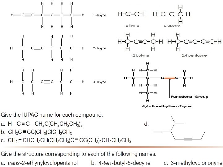 Alkyne Ø Ø Alkynes contain a carbon–carbon triple bond. Terminal alkynes has the triple bond at the end of the carbon chain, so that a hydrogen atom is directly bonded to a carbon atom of the triple bond. Ø Internal alkynes has a carbon atom bonded to each carbon atom of the triple bond.