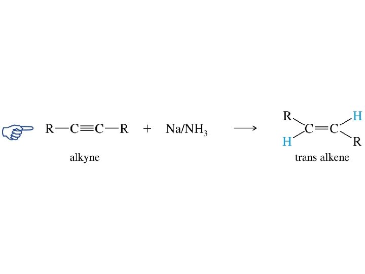 Partial Reduction RC CR' RCH CHR' RCH 2 R' Another way to convert alkynes to alkenes is by reduction with sodium (or lithium or potassium) in ammonia. trans-Alkenes are formed.