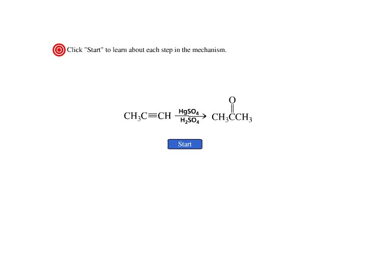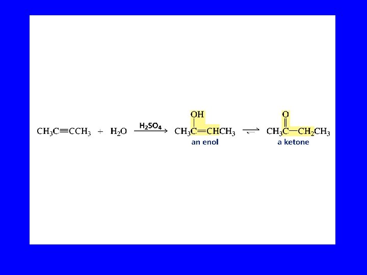 Hydration of Alkynes expected reaction: RC CR' + H 2 O H+ RCH CR' OH enol observed reaction: RC CR' + H 2 O H+ RCH 2 CR' O ketone
