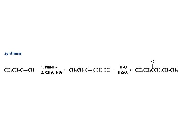 Example: Dialkylation of Acetylene H—C C—H 1. Na. NH 2, NH 3 2. CH 3 CH 2 Br CH 3 CH 2—C C—H 1. Na. NH 2, NH 3 2. CH 3 Br CH 3 CH 2—C C—CH 3 (81%)