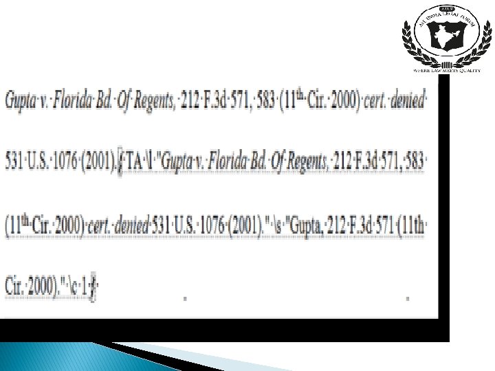 Problem 4: A single case or other authority listed twice The first citation of any case or other authority should be the only one marked with a "long" citation (see the Gupta illustration just above for an example of that TA code); all subsequent citations to that authority must be marked with a "short" citation (like the Harris TA code shown just above). The long citation codes include all three parts: the "/l", the "/s", and the "/c". The short citation codes only include the "/s". If you have more than one long citation code for one particular authority, that will cause that authority to appear twice in your TOA. Remove the extra long citation and re-mark that as a short citation.