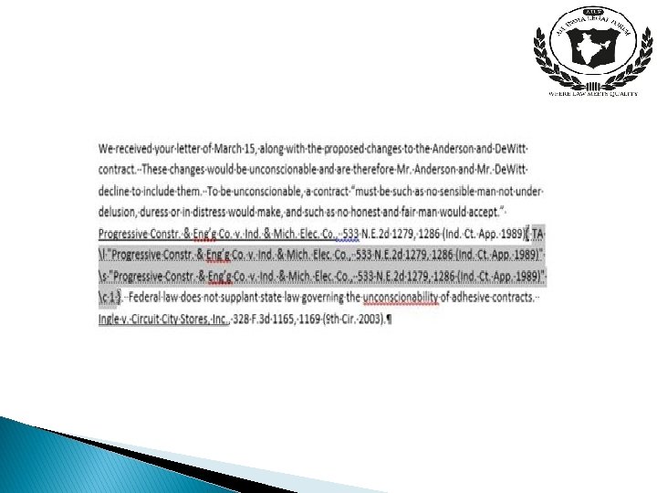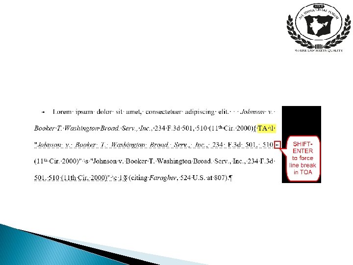 Problem 5: Case citations wrapping awkwardly Sometimes, the way a particular citation wraps to the next line irks you. It is possible to manually force a citation to wrap the line at a particular point. Just find the long citation (remember to turn on Show/Hide so you can see the "TA /l"), place your cursor at the desired wrapping point, and press SHIFTENTER. It'll look awkward in the TA code, but that will enable it to wrap at just the right spot.