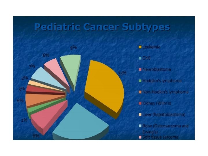 Brain Tumors- Important to know 20% of all malignancies in children Age 3 -7 years Most often infratentorial Sx: Persistent vomiting, headache, gait imbalance, diplopia, ataxia, vision loss, school deterioration, growth deceleration ▪ Associations with Inherited Genetic disorders: �Neurofibromatosis, Tuberous sclerosis, Von. Hippel-Lindau disease, Li-Fraumeni (glioma), Turcot syndrome ▪ ▪