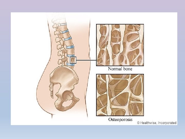 Feedback Loop • Heathy bones must store Calcium – requires a balance b/tw Calcitonin and PTH (parathyroid stimulating hormone) • If there is a high amount of Ca in diet: – Thyroid gland secrete calcitonin into blood, bones absorb Calcium, blood Ca drops • If there isn’t enough Ca 2+ in diet: – Parathyroid glands release PTH, causing bones to release stored Ca 2+ – Vitamin D causes intestines to absorb more Ca 2+ from food, blood Ca 2+ rises – Over time, leads to loss of calcium from bones (osteoporosis)