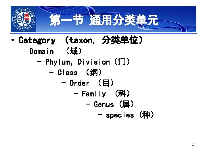 各级分类单元 All organisms 域 Domain 界 Kingdom 门 Phylum 纲 Class 目 Order 科 Family Eukarya Fungi Ascomycota Archaea Bacteria None assigned for archaea None assigned for bacteria Euryarcheota Proteobacteria Hemiascomycetes Methanococci Gammaproteobacteria Saccharomycetales Methanococcales Enterobacteriales Saccharomycetaceae Methanococcaceae Enterobacteriaceae 属 Genus Saccharomyces Methanothermococcus 种 Species S. cerevisiae Baker’s yeast M. okinawensis Methanococcus Escherichia E. coli 5