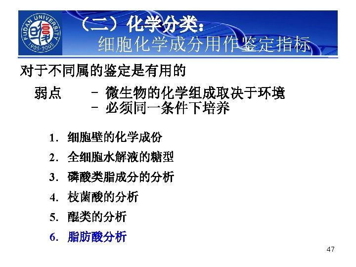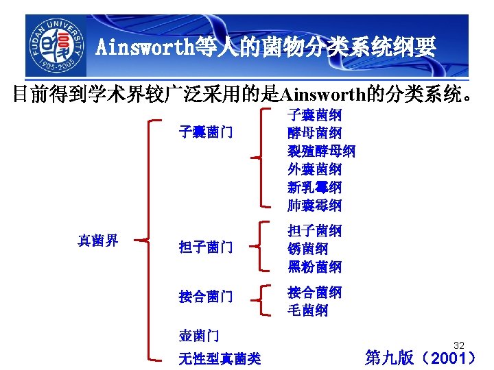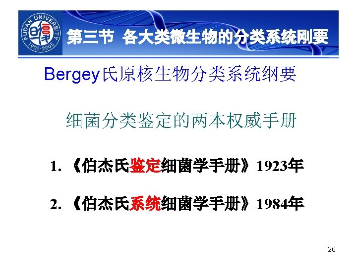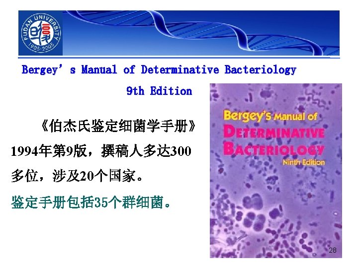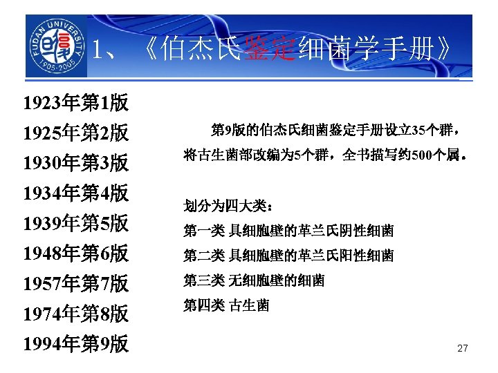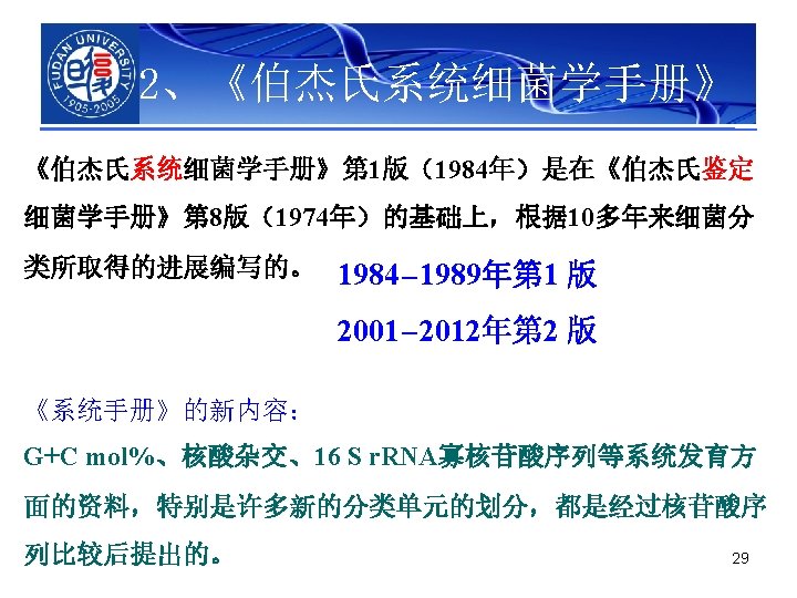 Bergey's Manual of Systematic Bacteriology (2 nd Edition ) Springer, New York Volume 1 (2001) The Archaea and the deeply branching and phototrophic Bacteria(古生菌及其分支和光和细菌) Volume 2 (2005)The Proteobacteria (变形菌门) Volume 3 (2009)The Firmicutes (厚壁菌门) Volime 4 (2011) The Bacteroidetes, Spirochaetes, Tenericutes (Mollicutes), Acidobacteria, Fibrobacteres, Fusobacteria, Dictyoglomi, Ge mmatimonadetes, Lentisphaerae, Verrucomicrobia, Chlamydiae, and Planctomycetes (拟杆菌门等微生物量少的菌) Volume 5 (2012)The Actinobacteria (放线细菌门) 31