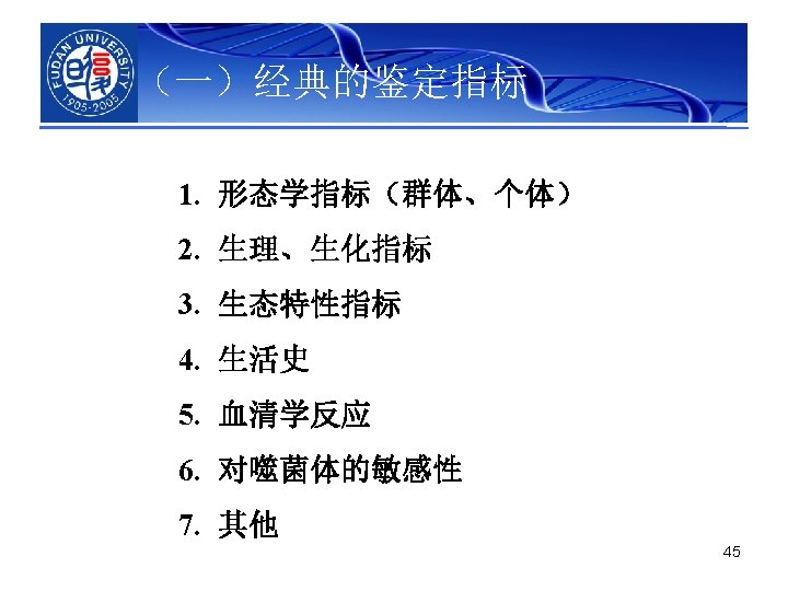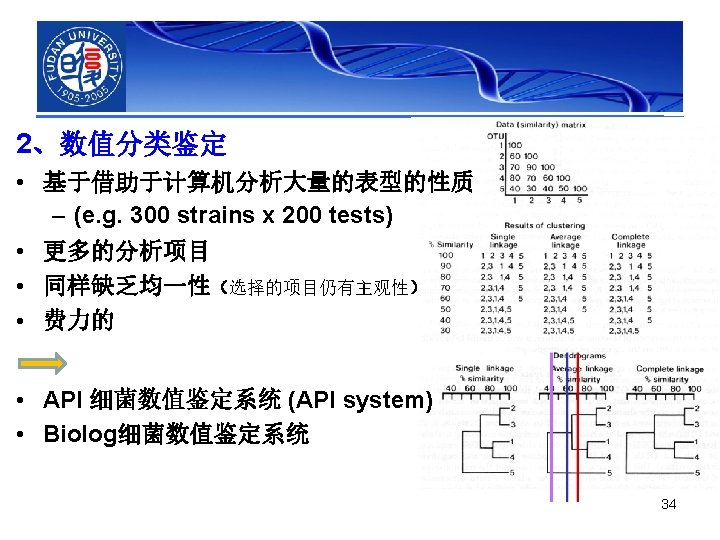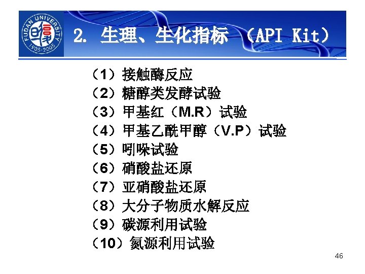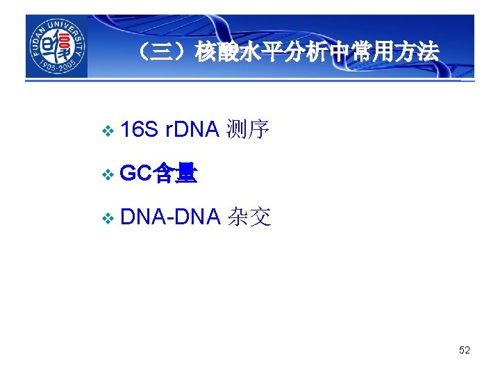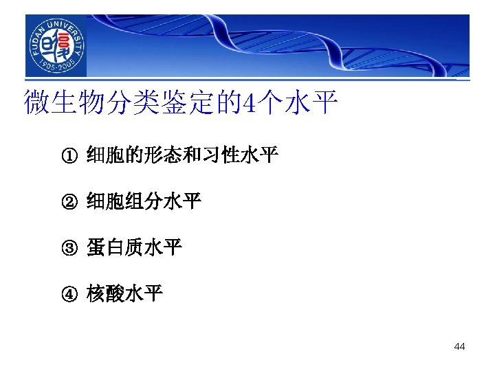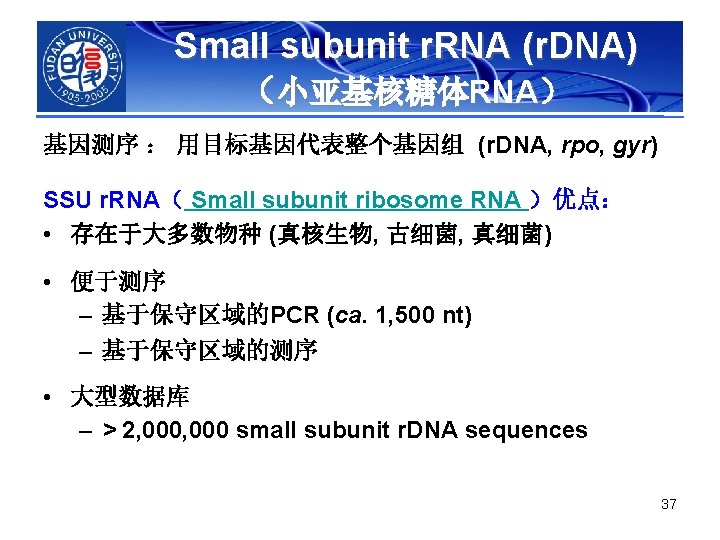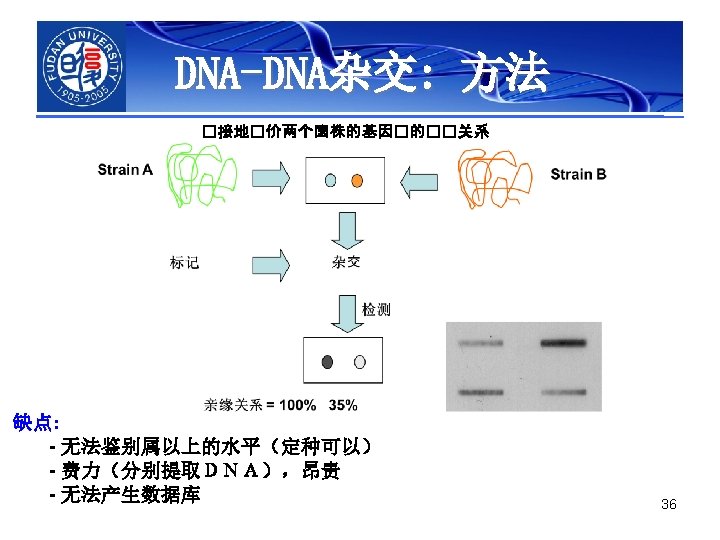 3、现代分类鉴定方法 • Committee on Reconciliation of Approaches to Bacterial Systematics of International Committee on Systematic Bacteriology (ICSB, 细菌系统学国际委员会) - Wayne et al. (1987) IJSB 37: 463 -464 – – 细菌的物种应该反应基因组的关系 基于直接或间接的测量基因组核苷酸序列的比较 基因组测序 (直接的) – 理想的,但以前是不切实际 DNA-DNA 杂交 (间接的) 种的定义 – 在最优化的杂交温度下,全基因组杂交,70%结合(同源性) – Tm 小于5度 【The phylogenetic definition of species generally would include strains with approximately 70% or greater DNA-DNA relatedness and with 5°C or less Tm. Both values must be considered. 】 35 (属于同一个种的标准:Tm 小于5度,且杂交同源性大于等于70%)