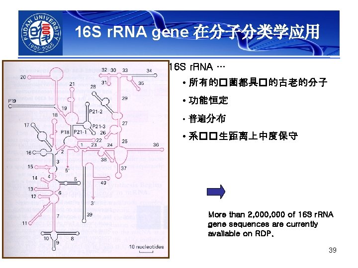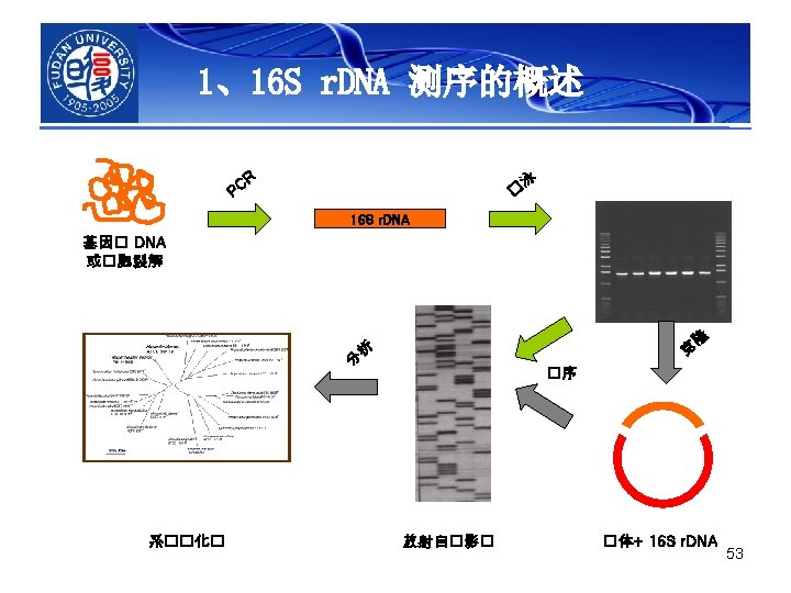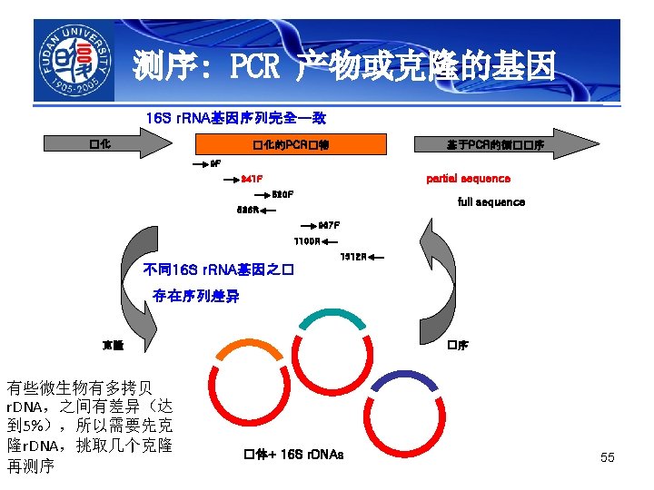 16 S r. RNA基因的PCR扩增 16 S r. RNA gene 9 F 341 F 518 F amplification 536 R 907 F 1100 R 1512 R Primer 1512 R 5’-ACGGCTACCTTGTTACGACTT-3’ 16 S r. RNA gene 1. 6 Kb Electrophoresis Primer 9 F 5’-GAGTTTGATCCTGGCTCAG-3’ 54
