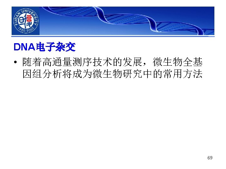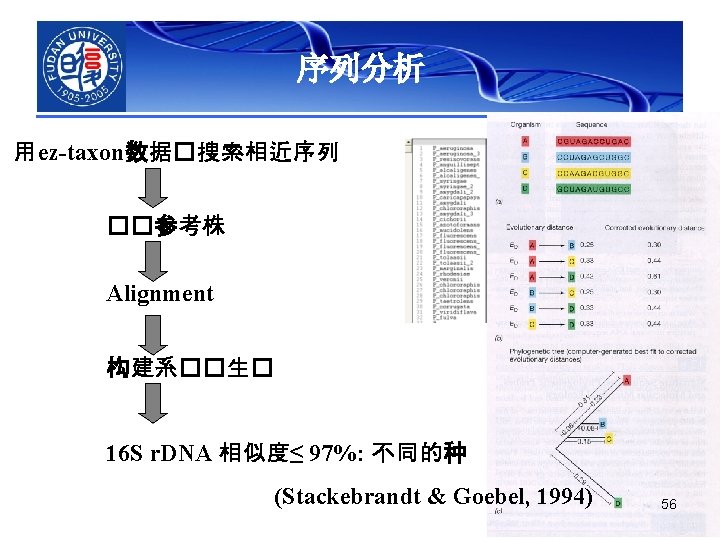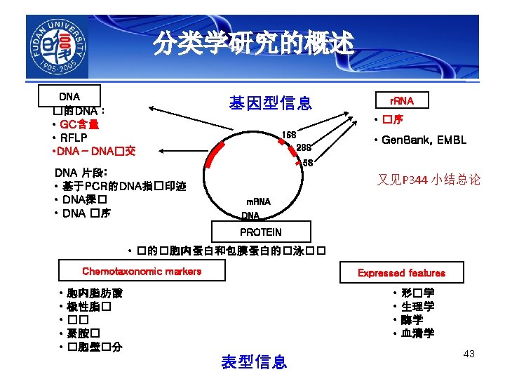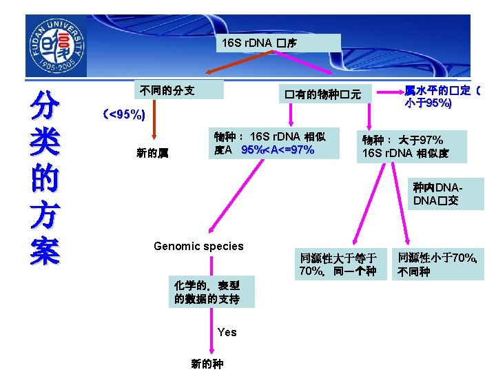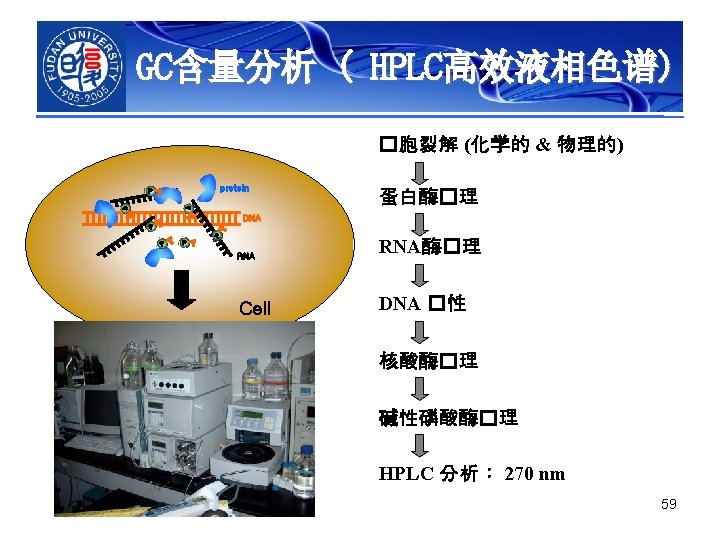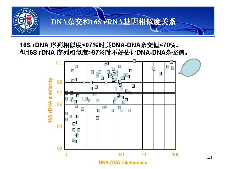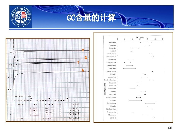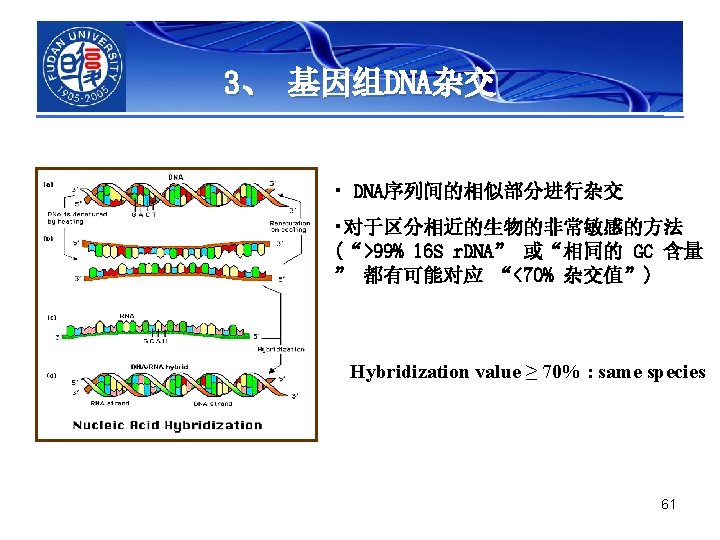 GC含量作为分类学的标记 • 原核生物之�GC 含量�化范� 20% - 80% • 相同的 GC 含量不意味着相同的碱 基�成 • Minimal value in the overall taxonomic characterization of genus and species G+C A+T+G+C ⅹ 100% Difference in mol% G+C = 0% ≠ same species Difference in mol% G+C ≥ 5% ≈ different species Difference in mol% G+C ≥ 10% ≈ different genus 58