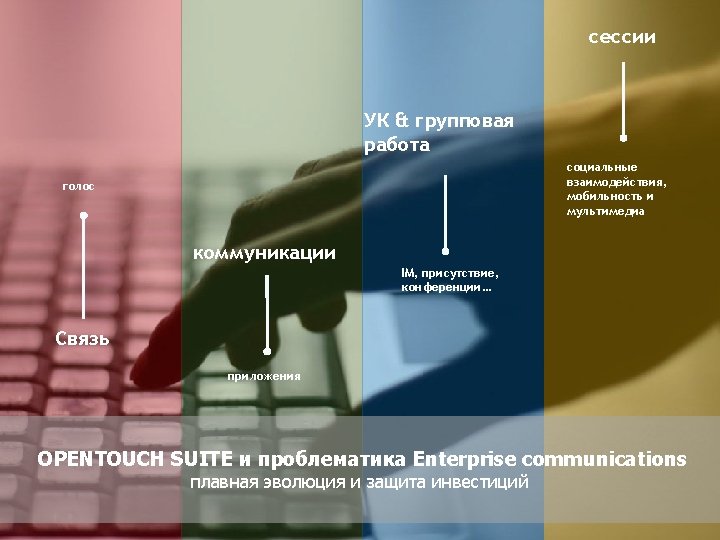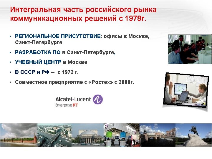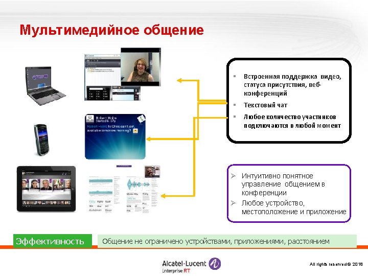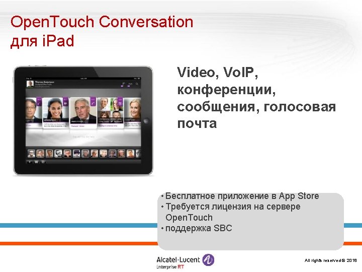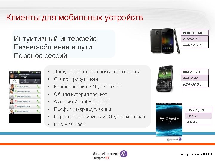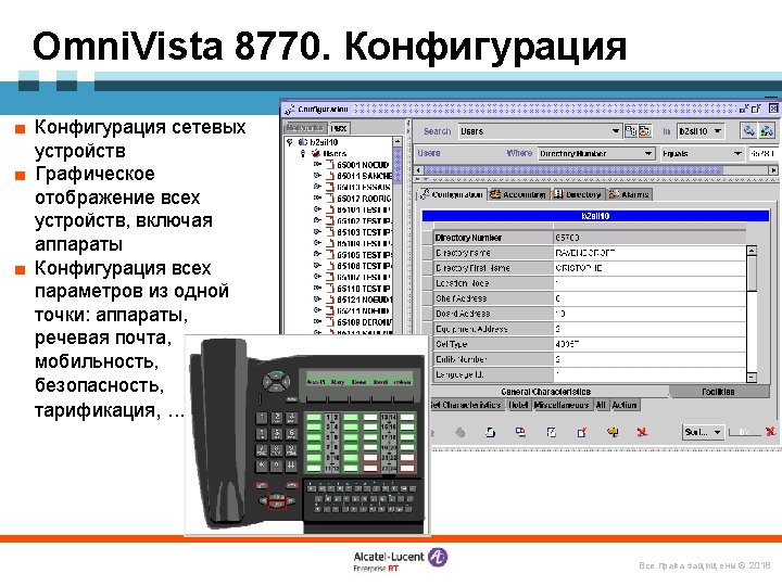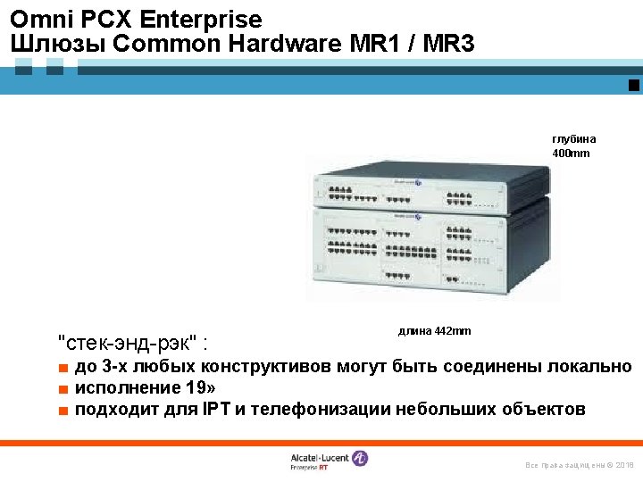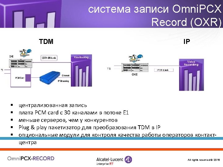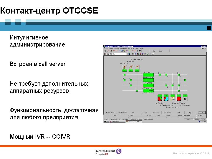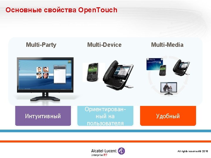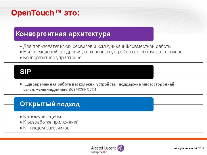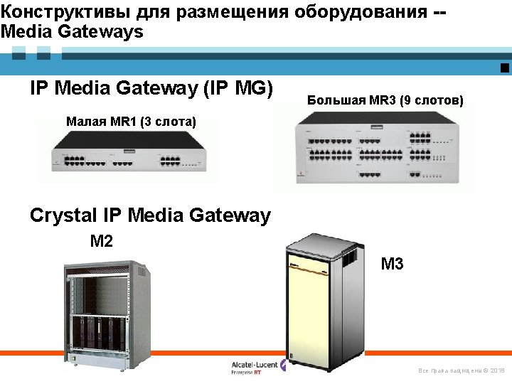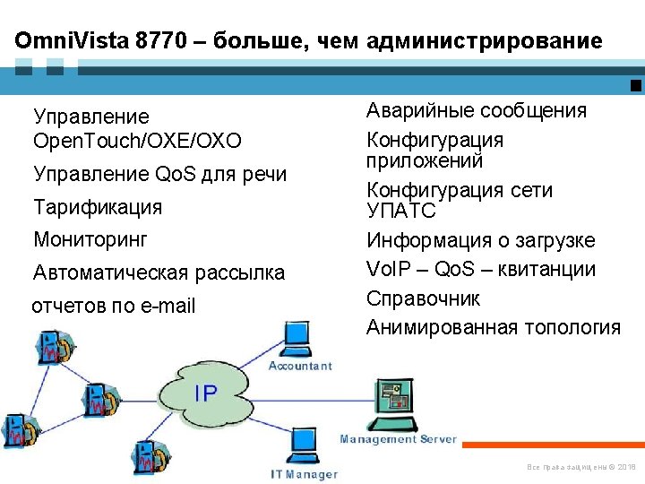 «Конструктор» Omni. PCX Enterprise Логические элементы и ПО Alcatel Omni. Vista 8770 -- управление Open. Touch – система мультимедиакоммуникаций Серверы и ПО Call Server Media Gateways IP CS Crystal RM 1 Alcatel Application Partner Program ЦОВ Omni. Touch/Altitude Appliance Server (INTELbased) RM 3 Виртуализация (VMware) M 2 M 3 IP – инфраструктура Терминалы Все права защищены © 2018