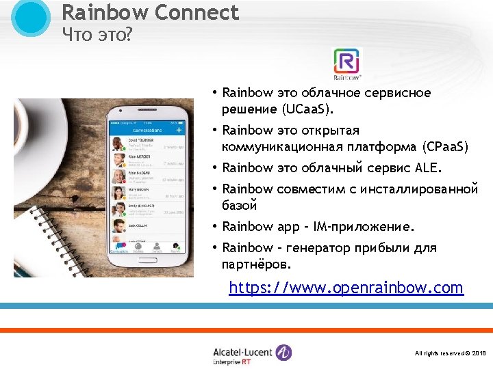 Rainbow Connect OXE 12 – Rainbow Connect Общая конфигурация с OXE Rainbow parameters can be entered with mgr, WBM tool or 8770 Запуск внутри Call Server More reliable connections with CSTA and MAO database. Easier maintenance and support. Поддержка High Availability mechanisms CPUs switch over. Automatic synchronization of settings between redundant CPUs All rights reserved © 2018