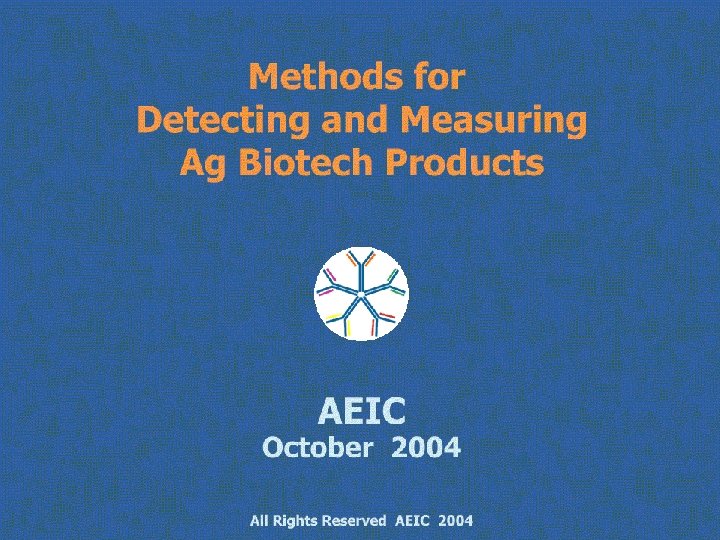 PCR Design Requirements Assay time Sample cost Availability Validation Application ELISA Strips DNA/Line specific Protein specific Sophisticated Moderate Easy 3 -14 days 2 -7 days 5 -10 min $400 -600 $100+ $7 -10 Published/Testing Co Diagnostic Co. Protein specific Diagnostic Co. JRC (qualitative) JRC/USDA Qualitative/semi-quant Qual/semi/quant USDA Qual/ test/ compliance with threshold Limitations Basic p. H, heat, extraction, Same as ELISA false pos, false neg reference materials pro-zone, dynamic sys Protein dependent 1 sample/test Sensitivity ~>0. 1% GMO ~>0. 3% GMO ~1% GMO All Rights Reserved AEIC 2004