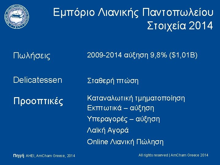 Εμπόριο Λιανικής Παντοπωλείου Στοιχεία Συσκευασμένου Τροφίμου 2014 σε εκατ. $ Πηγή AHEI, Am. Cham Greece All rights reserved || Am. Cham Greece 2014 All rights reserves | Am. Cham Greece 2014
