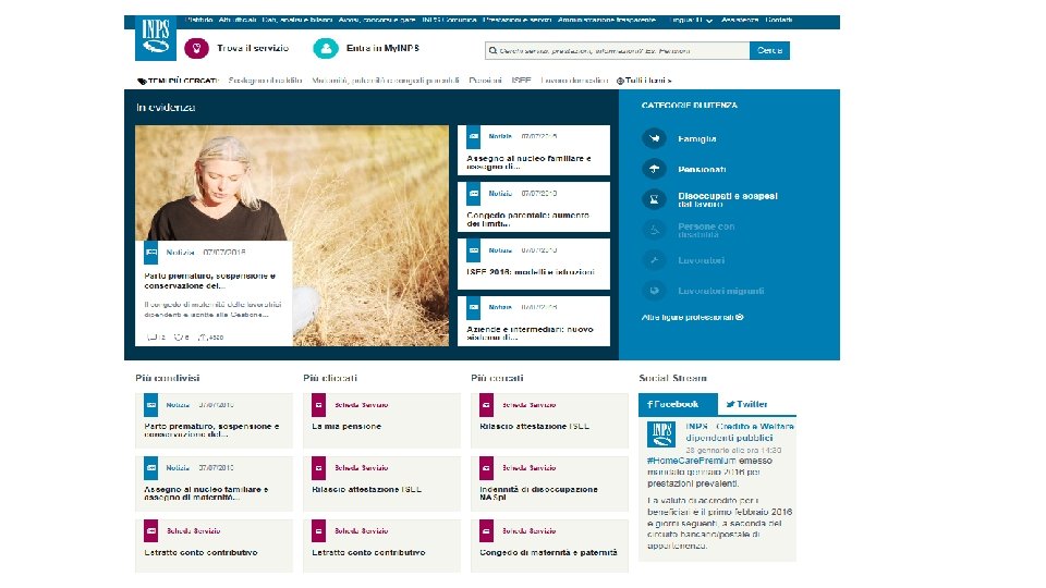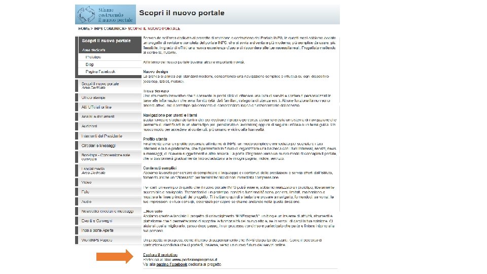 Alla scoperta del nuovo portale INPS Oggi INPS entra in una nuova fase. Inizia un percorso di semplificazione, flessibilità, personalizzazione, che porterà a un miglioramento del modo stesso di fruire i servizi online Un cambiamento importante, basato su un semplice principio: la persona al centro di tutto. Grazie ad esempio alla dashboard My. INPS, capace di indicizzare le caratteristiche e necessità dei singoli utenti, creando uno spazio personalizzato, dove ciascuno potrà trovare, ad ogni accesso, i dati e i servizi che realmente lo interessano. Il risultato è ora online nella versione prototipo, pronto a essere esplorato da chiunque voglia scoprirne le funzionalità……. . Vai su www. inps. it e scopri !!! Per arrivare alla versione definitiva, infatti, abbiamo bisogno del tuo aiuto: ci serve il feedback di chi si troverà a usare il sito in prima persona. È questo lo scopo del blog: uno spazio dove raccogliere impressioni, critiche, suggerimenti.