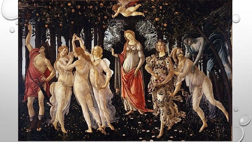 PRIMAVERA INTERPRETATION • THE GROUP OF MYTHOLOGICAL FIGURES IN THE NATURE SETTING TO REPRESENT THE IDEA OF THE BIRTH OF SPRING, WHILE SOME SUGGEST THAT THE WORK STANDS AS A METAPHOR FOR THE IDEA OF A NEOPLATONIC LOVE (ACCORDING TO NEO PLATONIC VIEWS, LOVE IS THE MAIN THING THAT BINDS ALL THINGS TOGETHER. AS MUCH AS THE CONCEPT WAS BASED ON THE EMOTION OF LOVE AND THAT IT CAN SUSTAIN ALL, THE FACT THAT HUMAN BEINGS ARE FUNDAMENTALLY SOCIAL IS ALSO CLEARLY BROUGHT UP IN THE CONCEPT. ) • WHAT ELSE HIDES IN THE CENTRAL VENUS FIGURE STANDING UNDERNEATH HER ARCH? IT IS ABOUT THIS URGE TO EXPLORE ALL THE ELEMENTS, WHICH BUILD THE COMPOSITION; IT IS IN THE SEARCH FOR A NEW MEANING THAT THE BEAUTY OF ALLEGORY IS UNVEILED.