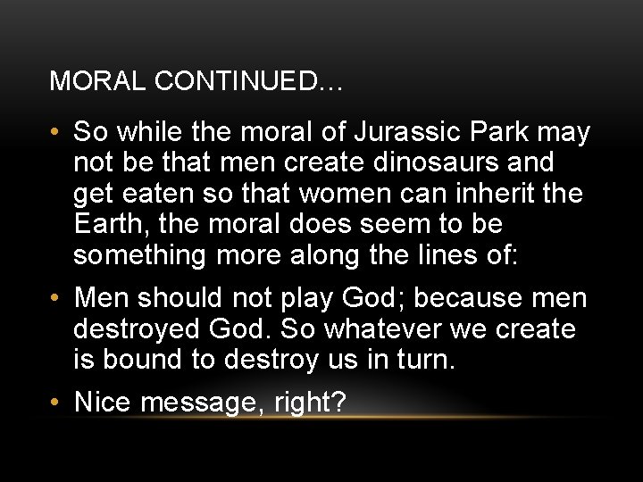 MORAL CONTINUED… • So while the moral of Jurassic Park may not be that men create dinosaurs and get eaten so that women can inherit the Earth, the moral does seem to be something more along the lines of: • Men should not play God; because men destroyed God. So whatever we create is bound to destroy us in turn. • Nice message, right?