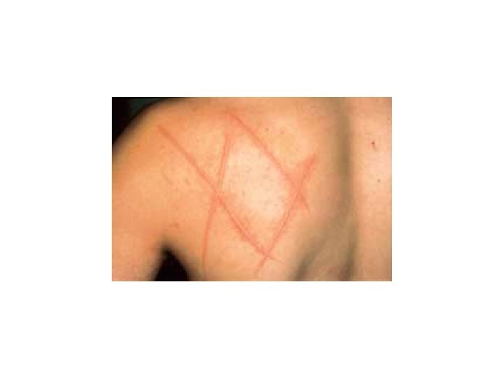 Urticaires physiques Certaines urticaires sont déclenchées par des stimuli physiques de la peau. Elles doivent être cherchées systématiquement à l’interrogatoire (facteurs déclenchants, topographie des lésions), et confirmées par les tests physiques réalisés après arrêt de tout traitement antihistaminique (au moins 4 jours auparavant). Dermographisme Le dermographisme peut être isolé ou associé à une urticaire. Il est de cause inconnue et son évolution peut être très prolongée. Appelé encore urticaire factice, il est déclenché par la friction cutanée. Il se traduit par des stries urticariennes oedémateuses, blanches en regard des lésions de grattage et peut être reproduit par le frottement à l’aide d’une pointe mousse.