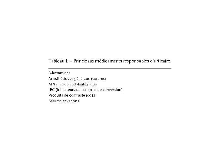 Urticaires médicamenteuses Il s’agit d’une cause assez fréquente d’urticaire aiguë et plus rarement d’urticaire chronique (avec les AINS, les IEC, etc. ). Les lésions apparaissent dans les minutes ou les heures qui suivent la prise du médicament et peuvent s’accompagner de signes systémiques. Le tableau I liste les médicaments souvent rapportés comme inducteurs d’urticaire mais tous les médicaments peuvent être en cause, quelle que soit leur voie d’administration. Les urticaires médicamenteuses sont peu sensibles aux traitements antiallergiques et sont de résolution plus longue que dans d’autres urticaires allergiques ; de nouvelles lésions pouvant ainsi apparaître pendant plusieurs jours malgré l’arrêt du médicament responsable.