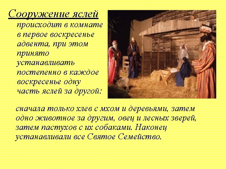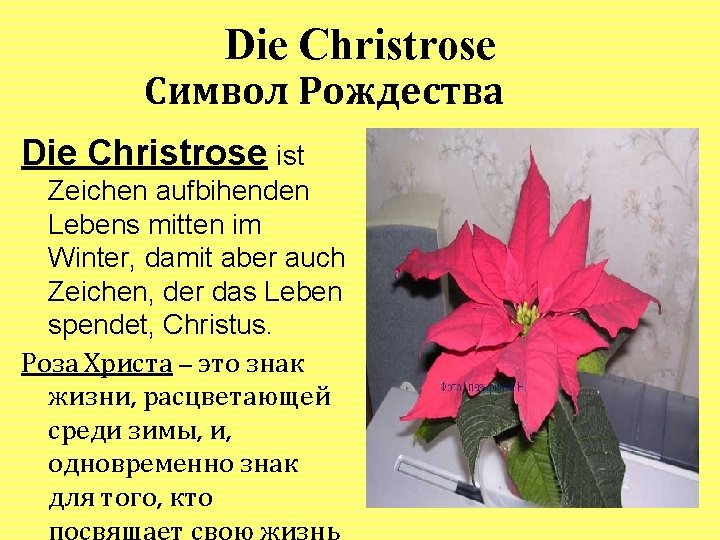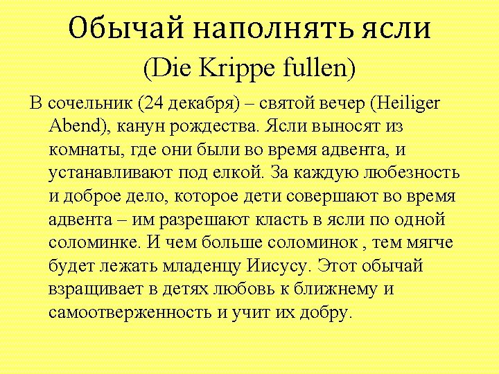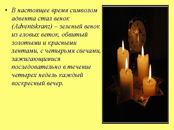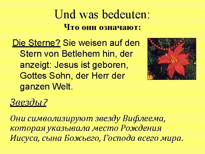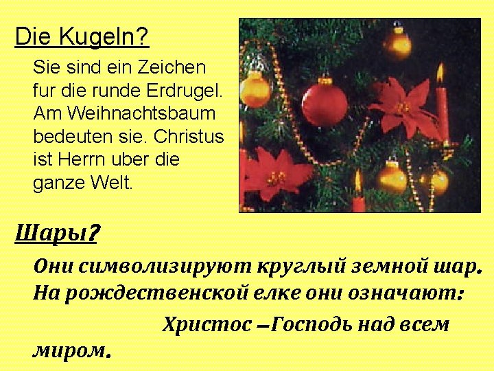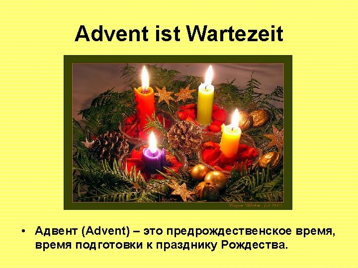 Die Kerzen? Sie lassen Licht ins Finsternis scheinen, sie geben Warme in der Kalte. An Weichnachten bedeutet das: Jezuz ist wie ein Licht in der Dunreltheit der Welt. Свечи? Они несут свет во тьму, дают тепло в холод. На Рождество это означает: Иисус – свет во тьме.
