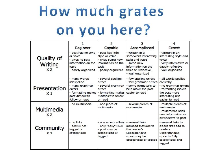 Qualities • Validity – does the instrument enable students to demonstrate qualities? Have you selected qualities that the curriculum expects students to demonstrate? • Reliability of judgements – do your criteria and standards produce reliability? Same for other grading approaches • Authentic audience improves quality. • Holistic verses analytical.