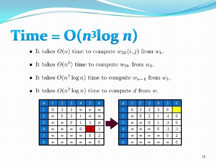 Floyd-Warshall: O(n 3) time w 1 2 3 4 5 6 d 1 2` 3 4 5 6 1 0 3 2 ∞ ∞ ∞ 1 0 3 2 3 0 2 2 ∞ 0 2 1 ∞ ∞ 2 ∞ 0 2 1 -2 0 3 ∞ ∞ 0 1 -2 0 4 ∞ ∞ ∞ 0 -3 1 4 ∞ ∞ ∞ 0 -3 -1 5 ∞ ∞ ∞ ∞ 0 2 6 ∞ ∞ ∞ ∞ ∞ 0 22
